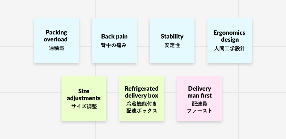 Miyajima and Venkat began their discussion by comparing the package and delivery situation in India and Japan. The ‘overloading’ in India, where delivery people are bombarded with numerous packages on their backs, led to discussions on how to alleviate their back aches especially during sweaty summers. Meanwhile, after Miyajima conducted user interviews with delivery people, they realized that delivery workers rely on their own know-how and DIY solutions to elevate their delivery experience. By gathering insights, Miyajima and Venkat identified that what delivery workers need are practical interventions for efficiency and comfort. Specifically, they would greatly benefit from packaging that address their stability, safety, and ability to control temperature.