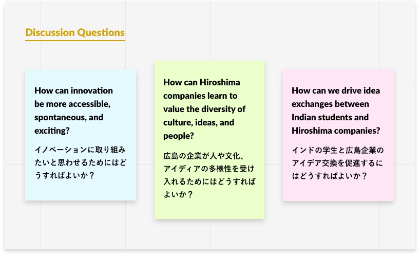 チームは広島の企業とインドの学生によるミニデザインアイデアソン「Co-Lab」を立ち上げ、地域の企業がグローバルとのコラボレーションを踏み出すための機会を提供しました。第1回となるアイディアソンでは広島の食品関連企業4社が集まり、業界の課題について話し合ったのち、インドのデザイン・工学部の学生たちにテーマを提示し、課題に対するアイデアを募集しました。集まったアイデアは広島の企業に、従来のビジネスの枠組みを超えた視座を与えるもので、持続可能性とデジタル変革を積極的に検討させるものでした。